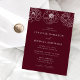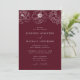 Elegante blumengeschmückte Hochzeitsfeiern mit einem hohen Rahmen an weißen Blume mit bordeauxfarbenem Hintergrund. Personalisieren Sie die bordeauxfarbenen Hochzeitseinladungen mit Ihren Namen und Hochzeitsdetails in weißer Schrift mit Akzenten der Kalligraphie. Entworfen, um mit unserer Hochzeitskollektion Dainty Floral zu koordinieren.