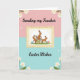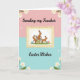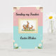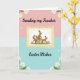 Designed with a soft pastel gradient, the top half glows rose-pink and fades into a calm sky-blue below, sprinkled with tiny white star shapes and corner daisies 🌷. In the middle, an off-white rectangular frame with a dotted golden border holds a cozy spring scene where three long-eared brown animals share a sweet, friendly moment 🐰. One larger animal relaxes in a sky-blue two-wheeled cart, sitting close to a small bouquet and a patterned oval as if enjoying a thoughtful gift. A smaller companion stands at the front of the cart, posed like it’s gently guiding the ride, while a third waits nearby beside a little cluster of decorated ovals on green ground. The lighting stays soft and calm, giving their simple faces a tender, caring look toward one another. Across the pink area, the words “Sending my Teacher” appear in black, flowing lettering that curves slightly. On the blue area below, “Easter Wishes” is written in the same black, flowing style, centered under the frame. Small white daisies peek in from the corners, and scattered white asterisks float across both color fields.