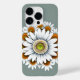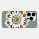 Ein digitales Bild zeigt eine Reihe von Gänseblümchen, die in einem runden Muster auf einem soliden grauen Hintergrund angeordnet sind. Die Molkereien werden mit einem sauberen, grafischen Stil gerendert, der ihre geometrischen Formen und Kontrastfarben betont. Die Blütenblätter der Gänseblümchen sind überwiegend weiß, mit subtilen grauen Schatten, die ihnen ein dreidimensionales Aussehen verleihen. Die Blätter sind glatt und haben einen leichten Schimmer, was auf eine glänzende oder glänzende Oberfläche hindeutet. Die Gänge sind in verschiedenen Farbtönen gehalten, einige mit einem hellen orangefarbenen Farbton, andere mit einer Mischung aus Gelb und Grün. Besonders detailliert ist die Zentralscheibe der größten Disy mit einem strukturierten Muster, das die natürliche Struktur des Samenkopfes einer Blume nachahmt. Die Gesamtkomposition ist ausgeglichen und symmetrisch, wobei die Gänge so angeordnet sind, dass das Auge in die Bildmitte gezeichnet wird. Die Verwendung eines soliden Hintergrunds hilft, die Blume zu isolieren und ihre Form und Farbe zu betonen. Das Gemälde ist modern, minimalistisch, mit einem Schwerpunkt auf sauberen Linien und einfachen Formen.