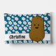 Bewundernswerte Kosmetiktüte mit einer niedlichen Cartoon braunen Kartoffel. Der Hintergrund ist ein niedliches Blumenmuster mit weißen, blühenden Blume in Meeresblau. Eine Vorlage, um Ihren Namen zu personalisieren.