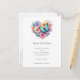 Save the date postcard with a beautiful illustration. A heart-shaped bouquet of flowers in pastel blue, green, purple and yellow. With a lovely blue butterfly hovering in front.