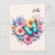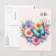 A postcard with a beautiful illustration. A heart-shaped bouquet of flowers in pastel blue, green, purple and yellow. With a lovely blue butterfly hovering in front.