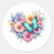 Stickers with a beautiful illustration. A heart-shaped bouquet of flowers in pastel blue, green, purple and yellow. With a lovely blue butterfly hovering in front.