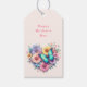 Gift tags with a beautiful illustration. A heart-shaped bouquet of flowers in pastel blue, green, purple and yellow. With a lovely blue butterfly hovering in front.