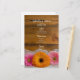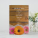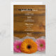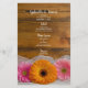 Das charmante Daisy Trio Country Barn Wedding Menu mit den Details des Essens, das Sie an Ihrem lässigen und dennoch eleganten Brautparty Mittag, Ehe Empfang Dinner oder Post Hochzeit Brunch servieren. Es kann mit den Namen der Braut und des Bräutigams, Ort und Veranstaltungsdatum personalisiert werden. Dieses rustikale, schicke, individuelle Ranch-Hochzeitsmenü bietet ein malerisches Blumenfoto von zwei rosa Gänseblümchen und einem orangefarbenen Schleier, einem weißen Brautschleier und einem braunen Hintergrund aus verwittertem Scheunenholz. Perfekte Inspiration für Ihre Feier im Bauernstil.