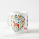 Embrace the Danish and Norwegian concept of Hygge—a feeling of cozy contentment and well-being—with this charming coffee mug. The design features a heart shape filled with traditional Scandinavian folk art motifs, including a Dala horse, stylized birds, and vibrant florals. This mug makes a beautiful, thoughtful gift idea for anyone who loves Nordic decor, traditional designs, and cozy home aesthetics. It's the perfect vessel for your slow morning tea or coffee.