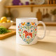 Embrace the Danish and Norwegian concept of Hygge—a feeling of cozy contentment and well-being—with this charming coffee mug. The design features a heart shape filled with traditional Scandinavian folk art motifs, including a Dala horse, stylized birds, and vibrant florals. This mug makes a beautiful, thoughtful gift idea for anyone who loves Nordic decor, traditional designs, and cozy home aesthetics. It's the perfect vessel for your slow morning tea or coffee.