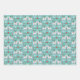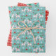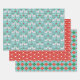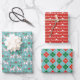 Set aus Papier mit drei passenden Weihnachtsmustern: Schwedische Dalapferde in Weiß mit Grün, Blume und Herzen; rot-weiße Blumen; und grün, rot, blau und weiß kariert.