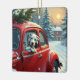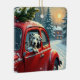 A nostalgic winter painting of a Dalmatian peeking out from a red car during a snowy Christmas drive. A classic holiday artwork that evokes warmth, adventure, and joyful anticipation.