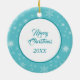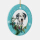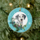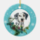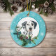 An der Vorderseite dieses Holiday-Ornaments befindet sich ein wunderschönes Porträt eines Dalmatiner-Hundes, der aus einem heiligen und immergrünen Husten herausschaut. Rote Beeren und Kiefernkonen schmücken die Kiefer- und Kiefernspieße. Das Bild wird auf einem weißen Kreis gerahmt durch ein Retro-blaues Schneeflockenmuster platziert. Die Rückseite des Ornaments hat den gleichen Hintergrund und Kreis mit Ihrem benutzerdefinierten Text in blau auf einem weißen Hintergrund.