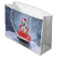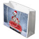 Dalmatiner Hund im Schnee sitzen im Weihnachtswage Große Geschenktüte