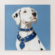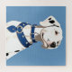 Stilvolle Abbildung eines Dalmatiner-Hundes mit einem blauen Kragen vor einem schlichten Hintergrund, die sein gepunktetes Aussehen und freundliches Verhalten deutlich macht.