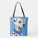 Illustratives Porträt eines Dalmatiner-Hundes mit einem blauen Kragen, der seine charakteristischen schwarzen Flecken vor einem sauberen blauen Hintergrund zeigt und die Hundeeleganz, die Tierpflege und die Tierwelt repräsentiert.