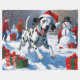 Ein gepunkteter Dalmatiner läuft spielerisch durch die schneebedeckte Winterlandschaft und trägt einen festlichen, roten Weihnachtshut. Dieses lebendige Design unterstreicht den unverwechselbaren Mantel der Rasse, die energetische Persönlichkeit und den fröhlichen Geist, während es die Wärme und Freude der Ferienzeit einfängt. Ein herzlicher Winterurlaub voller festlichen Charme.