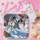 Ein gepunkteter Dalmatiner läuft spielerisch durch die schneebedeckte Winterlandschaft und trägt einen festlichen, roten Weihnachtshut. Dieses lebendige Design unterstreicht den unverwechselbaren Mantel der Rasse, die energetische Persönlichkeit und den fröhlichen Geist, während es die Wärme und Freude der Ferienzeit einfängt. Ein herzlicher Winterurlaub voller festlichen Charme.