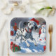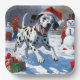 Dalmatiner läuft im Schnee mit Weihnachtshut Pappteller