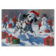 Ein gepunkteter Dalmatiner läuft spielerisch durch die schneebedeckte Winterlandschaft und trägt einen festlichen, roten Weihnachtshut. Dieses lebendige Design unterstreicht den unverwechselbaren Mantel der Rasse, die energetische Persönlichkeit und den fröhlichen Geist, während es die Wärme und Freude der Ferienzeit einfängt. Ein herzlicher Winterurlaub voller festlichen Charme.