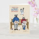 Wünschen Sie allen Briten und Anglophilen in Ihrem Leben einen guten Geburtstag mit dieser lustigen Karte, die Dotty Hund, den Dalmatiner, und Furry Freund, Kitty zeigt, am Meer sitzend, Fisch und Pommes Frites an einem kalten, nassen, windigen Tag, während sie von Möwen angegriffen werden. Der Text lautet "Einen wirklich britischen Geburtstag wünschen".