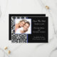 Mit unseren Ankündigung Datum freihalten Cards kündigen Sie Ihre zukünftige Hochzeit mit einem wunderschönen schwarz-weißen Damast-Muster mit einem dunkelblauen Foto-Rahmen an. Fügen Sie einfach Ihre Hochzeitsinformationen und Foto und Sie sind alle Set zu gehen! Passende Briefmarke und Umschlag Aufkleber in unserem Shop