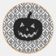 Dieser Aufkleber ist mit einem schwarz geschnitzten Kürbis auf einem schwarz-weißen Damast-Hintergrund gestaltet.