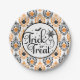 Dieses Party-Plattendesign zeichnet sich durch ein Mitte-Halloween-Design aus, das auf einem schwarz-orangen Kürbis-Damast-Hintergrund mit Fledermäusen und Spinnennetzen "trick or treat"- und "trick"-Stil sagt.