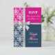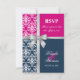 © 2013 Sozialite Designs. Elegante Hochzeitskarte RSVP für eine Sommerhochzeit mit weißem Damast, bedrucktem Silberband und Bogen, zwei Hintergrundfarben marineblau und fuchsia. Bitte kontaktieren Sie Socialite Designs, wenn Sie eine andere Farbkombination, Hilfe bei der Anpassung oder andere Hochzeitsprodukte, die mit diesem Design erstellt wurden, wünschen. BITTE BEACHTEN SIE, DASS DAS RIBBON EIN BILD IST UND AUF DIE EINLADUNG DRUCKT WIRD.