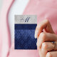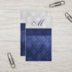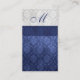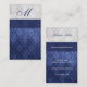 Eine elegante Visitenkarte mit einem Monogramm für einen Wellness-Center, Stylist oder Berater, mit einem blauen Damastmuster in Verbindung mit Silberakzenten.