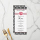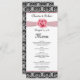 Einladung zum Hochzeitsmenü, mit schwarz-weißem Damast-Muster versehen und mit gedruckten Bildern von rosa Rose und Band dekoriert. Sie können es für jeden Anlass nutzen - Hochzeit, Verlobung, Brautparty, Probe Dinner, Party, Feiern., Geschäftstreffen. Stellen Sie einfach den Text nach Ihren Wünschen ein.