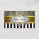 Damask, Schwarz-weiß Stripe, Gold Ribbon, Gold Label Visitenkarte Diese elegante Visitenkarte bietet eine goldgeprägte Optik Damaske auf einem grau-grau Hintergrund, schwarz-weiß Streifen, ein goldfarbenes Band und ein goldfarbenes gerahmt weißes Label. Das Design ist bereit, mit Ihrem Namen auf der Vorderseite personalisiert zu sein, und andere Informationen auf der schwarzen gerahmten Rückseite. Bitte beachten Sie, dass es sich um ein grafisches Design handelt, das keine tatsächliche Stoffprägung, kein Farbband oder keine Goldprägung enthält