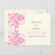 Elegantes Damasmotiv pink, grau, Elfenbeinhochzeit Speichern Sie das Datum Postkarte. Modernes und dennoch klassisches Hochzeitsdesign mit Retro-Flair. Delikat, mit dem eleganten Pariser Schriftart und einem Vintagen Ambiente, perfekt für zeitgenössische oder traditionelle Hochzeiten im Frühling, Sommer oder Winter.