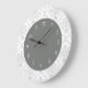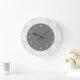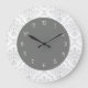 Graue und weiße Damast-Wanduhren mit hübschem Damast-Muster und extravaganten Zahlen auf der Uhr in diesem dekorativen Wanddekor-Uhrendesign für Ihre Küche, Esszimmer oder jedes Zimmer in Ihrem Haus, das Sie gewollt haben, um etwas Farbe und Charakter hinzuzufügen. Die Farben sind grau und weiß.