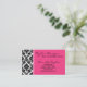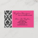 Dieses 2x3.5 sortierte schönen Damast und Pink farbige Visitenkarte ist für jedes mögliches Geschäft perfekt und ist vollständig kundengerecht! Wir haben eine gesamte Linie, die hier diesem Entwurf an zazzle Speicher unter gewidmet wird * entwerfen Sie Sammlungsmenüvorsprung, um Einladungen (12x18), Rückkehr-Aufkleber, verschickende Aufkleber, Umschlag Aufkleber, Porto-Briefmarken, Schalen-Kuchen-Auswahl, Wasser-Flaschen-Verpackungen, Hersheys 1,55 Unze einzuschließen. Große Bar-Verpackungen, Hersheys Miniaturaufkleber, Mikrowellen-Popcorn-Taschen-Verpackungen, DruckPlatzkarten, Sachen-Taschen-Deckel, danken Ihnen FLACH kardiert (4x5), GEFALTET danken Ihnen Karten (4x5), Bevorzugungs-Umbauten, Menü-Karten, tadellose Matchbooks, Lutscher-Abdeckungen, Lesezeichen, Bingo-Karten, Bingo-Karten-Markierungen, Bingo-Karte ausrufen Blätter, Druckratekarten (4x5), etc.