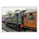 Ein schön wieder hergestellter Dampfzug und Wagen einer vergangenen Ära, die zu der Bahnstation kommt. England Großbritannien.