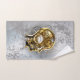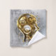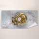 Konzeptioneller, mechanischer, menschlicher Kopf mit antiken Manometer und Metallgetrieben vor grauem industriellem Hintergrund. Steampunkstil.