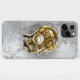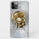 Konzeptioneller, mechanischer, menschlicher Kopf mit antiken Manometer und Metallgetrieben vor grauem industriellem Hintergrund. Steampunkstil.