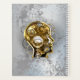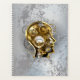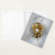 Konzeptioneller, mechanischer, menschlicher Kopf mit antiken Manometer und Metallgetrieben vor grauem industriellem Hintergrund. Steampunkstil.