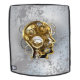Konzeptioneller, mechanischer, menschlicher Kopf mit antiken Manometer und Metallgetrieben vor grauem industriellem Hintergrund. Steampunkstil.