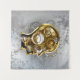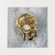 Konzeptioneller, mechanischer, menschlicher Kopf mit antiken Manometer und Metallgetrieben vor grauem industriellem Hintergrund. Steampunkstil.