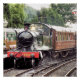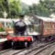 Eine wunderschön restaurierte Dampfbahn und Waggons vergangener Zeiten, die am Bahnhof ankommen.