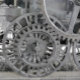 Ein fotografisches Design der Räder eines sehr frühen Modells eines Dampfzuges.