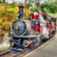 Eine schön restaurierte rote Dampfbahn und Wagen.