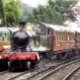 Eine wunderschön restaurierte Dampfbahn und Waggons vergangener Zeiten, die am Bahnhof ankommen. England UK.