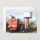 Eine schön restaurierte Dampfbahn, die mit Wasser aus dem Wassertank gefüllt wird. Im Hintergrund befindet sich ein wiederhergestelltes Signalfeld.