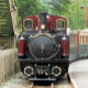Wales, das Land der kleinen Dampfzüge. Ein wunderschön erhaltener roter Zug und grüne Waggons voller Passagiere.