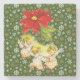 Dancing Baby Angels hängt von einer Poinsettia Blume mit goldweißen und weißen Schneeflocken auf grünem Hintergrund für tolle Untersetzer!