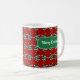 Dancing Christmas trees on a festive mug. Use "Personalize this template" to change the "Merry Christmas!" text and create a unique, customized gift; text changes are reflected on both sides. Enjoy a comforting hot chocolate at Christmas in this mug, featuring a busy pixel art pattern of dancing Christmas trees. A traditional xmas spruce or pine sat in an orange pot, decorated in gold, red and blue baubles or decorations, with silver tinsel and gold star on top. In a retro, blocky pixel art style.