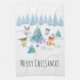 Ein Küchentuch mit einer skurrilen Weihnachtsszene. Gute Waldtiere tanzen um einen verzierten Weihnachtsbaum herum. Festlicher Urlaub Aquarell Design.
