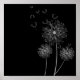 Ein wunderschönes Design einer Blume aus weißem Löwenzahn, die in der Brise weht. Dieses einfache, schwarz-weiße, moderne Blumendesign steht auf einem schwarzen Hintergrund, um Einfachheit, Reinheit und Schönheit zu kennzeichnen.