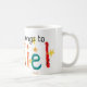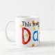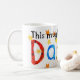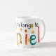 Eine weiße Tasse mit einem handgemalten "Collagen" Entwurf und der bunten, Stern-spangled Aufschrift "diese Tasse gehört Daniel"