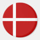 Die rot-weiße Flagge Dänemarks, oder Dannebrog, hat ein nordisches oder skandinavisches Kreuz. Das Rote ist der Hintergrund, das Kreuz ist in Weiß. Die dänische Flagge zeigt hier auf einem runden Magneten.
